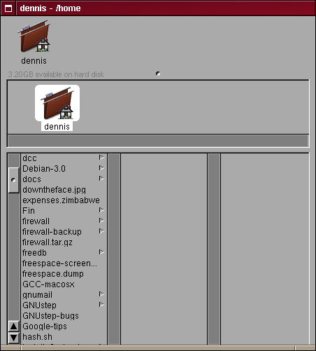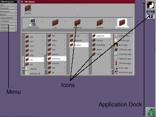 Files, application programs and other items you work with on a computer are represented by images or objects. The basic look of a GNUstep Workspace is something like this (Your desktop will probably not exactly match this picture).
